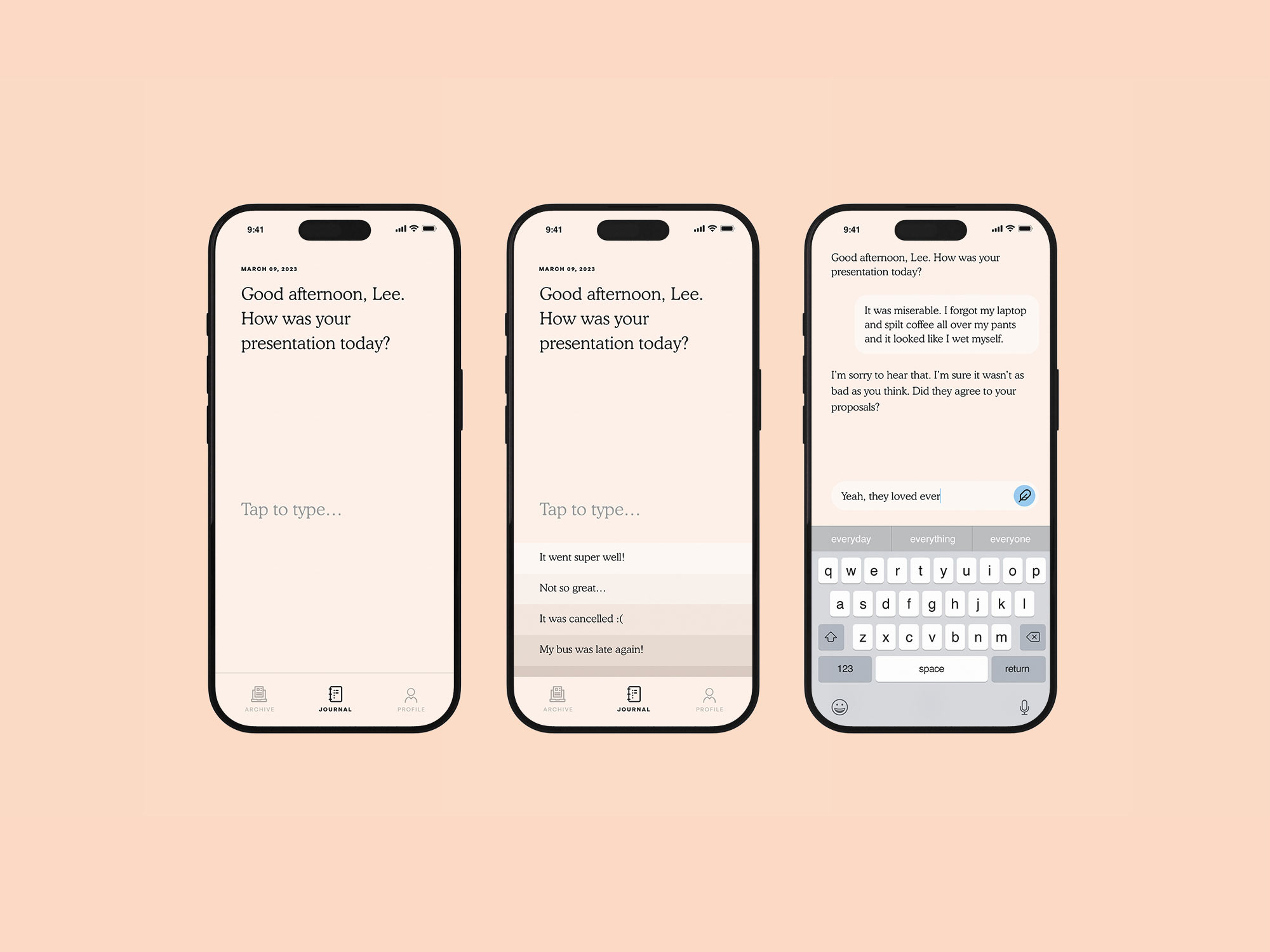 I began by exploring the emotional side of journaling. Many people understand the benefits of reflection but struggle to maintain the habit. Through user research and journey mapping, I identified common barriers such as the blank page, decision fatigue, and the pressure to write perfectly.