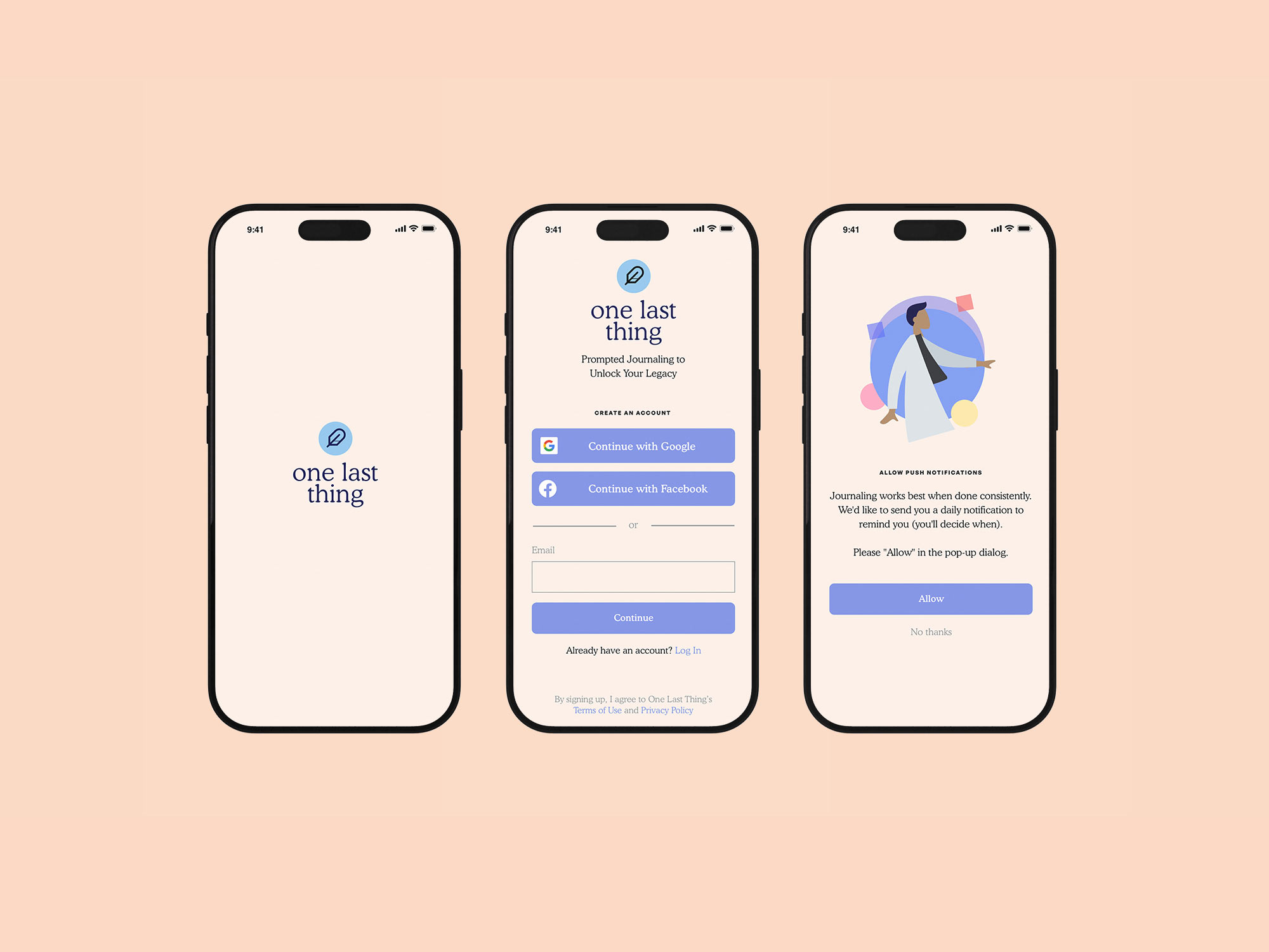 Alongside the app design, I developed the complete brand identity for One Last Thing, including the logo, wordmark, and color palette. The visual language reflects mindfulness and emotional clarity, combining simplicity with softness across the app and promotional materials.